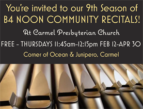 You are invited to enjoy these FREE Thursday recitals (Feb 12-Apr 30) with Eun Ha Chung, on CPC's AHLBORN-GALANTI digital/pipe organ & Steinway concert grand piano. Most weeks will also highlight local musicians (professionals & students). Stay the whole time, or pop in for a song at lunch or on your way to/from the Carmel Farmer's Market.