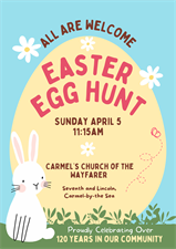 Easter Egg Hunt at Church of the Wayfarer All are Welcome to our Annual Easter Egg Hunt on Sunday April 5 at 11:15 am Set a Reminder Enter your email address below to receive a reminder message. Email address Select the amount of Days before the event -- Select Days Before Event -- 1 Day 2 Days 3 Days 1 Week Captcha Validation Please complete the Captcha Submit Date and Time Sunday Apr 5, 2026 11:15 AM - 12:15 PM PDT SEaster Sunday, April 5 at 11:15 am Location Church of the Wayfarer, Seventh and Lincoln, Carmel-by-the-Sea Fees/Admission Free Set a Reminder Enter your email address below to receive a reminder message. Email address Select the amount of Days before the event -- Select Days Before Event -- 1 Day 2 Days 3 Days 1 Week Captcha Validation Please complete the Captcha Submit Share × Print Email Add to Calendar Facebook Twitter LinkedIn Tell a Friend × Select Calendar Type × Google Yahoo iCal (Outlook, Apple, or other)