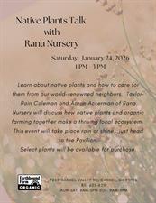 Learn about native plants and how to care for them from our world-renowned neighbors. Taylor-Rain Coleman and Aaron Ackerman of Rana Nursery will discuss how native plants and organic farming together make a thriving local ecosystem.