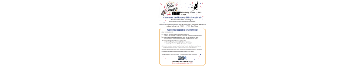 Come meet the Monterey Ski & Social Club Mountain Mike’s Pizza- 724 Abrego St. across the street from Hotel Abrego in downtown Monterey. $10 for pizza and salad—OR—Current members, bring a prospective new member and you both get in for FREE! PLUS Door Prizes!