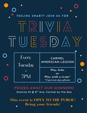Challenge your brain cells and wear your most intelligent thinking cap for a night of interesting and "what, who knew" with your friends at the American Legion Post 512 in Carmel-by-the-Sea. Arrive solo, we'll partner you up. Dinner and dessert is generally provided with a $10 donation.